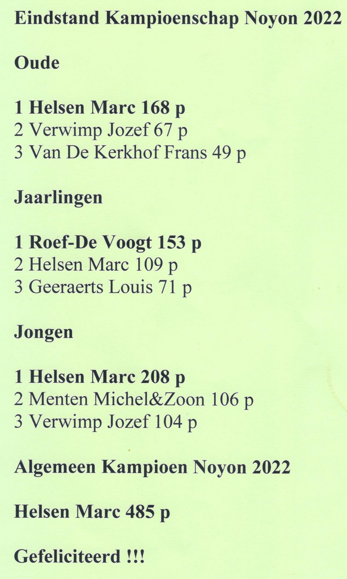 - Kampioen Oude duiven Noyon: Marc Helsen Westerlo