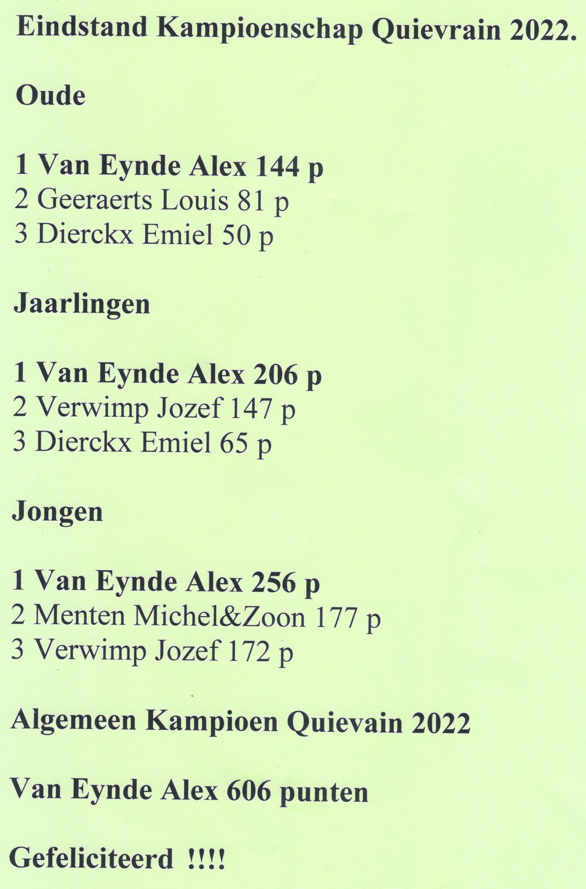 - Kampioen Jaarse duiven Quievrain: Alex Van Eynde Geel