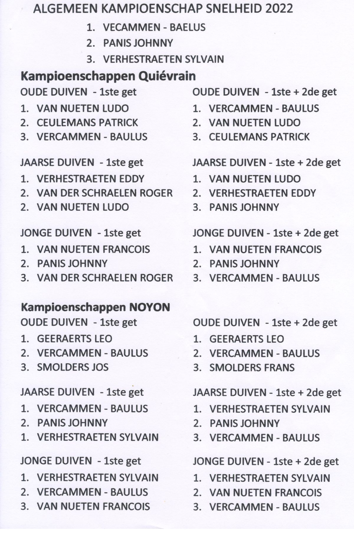 - Kampioen jonge duiven 1° get Quievrain: Francois Van Nueten (Herentals)