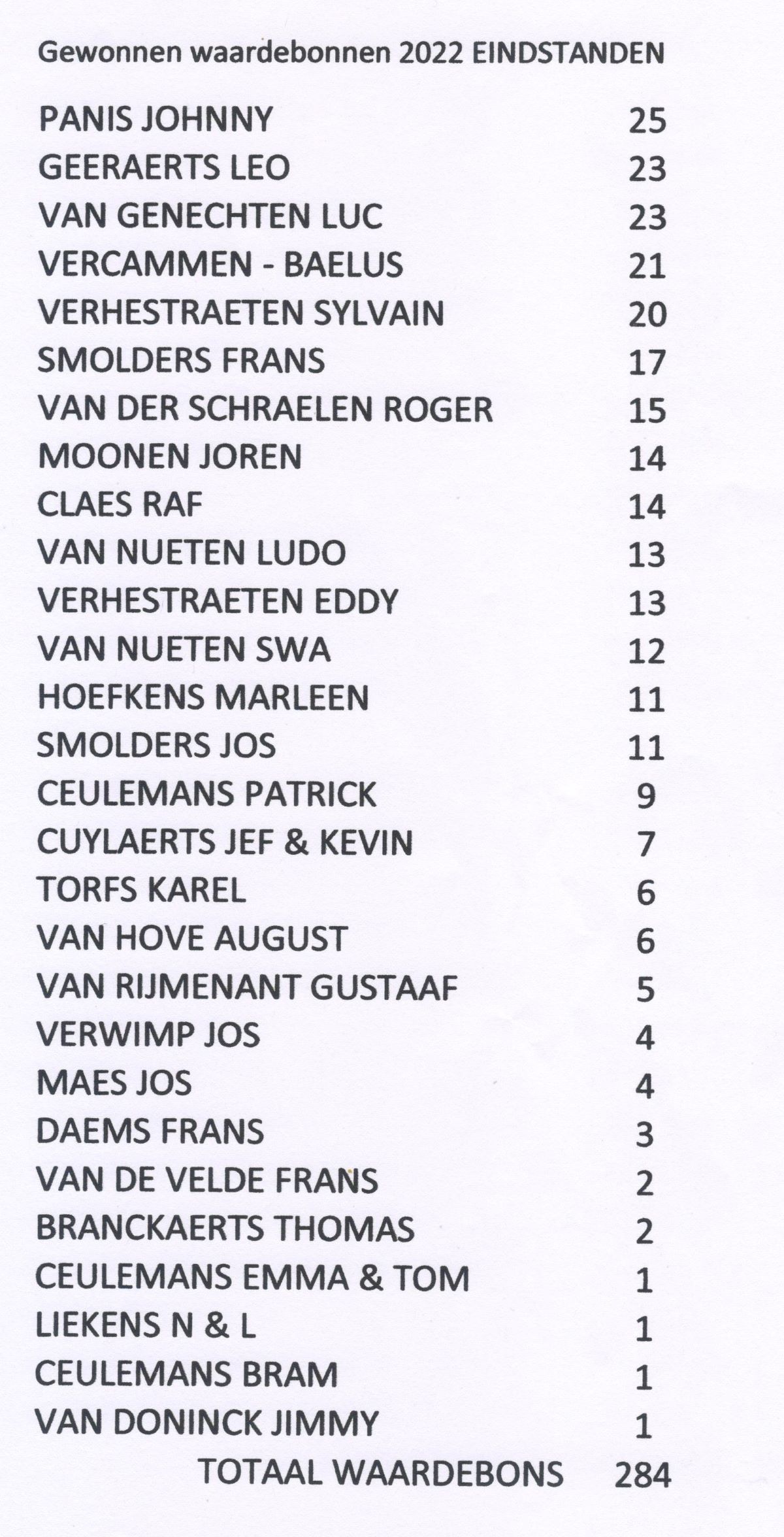 - Kampioen jaarse duiven 1° get Quievrain: Eddy Verhestraeten (Herentals)