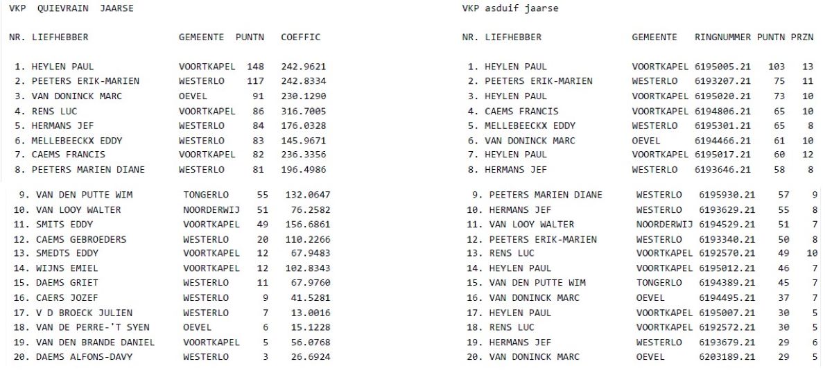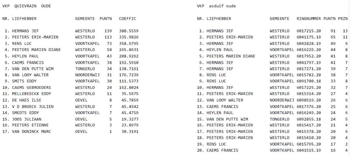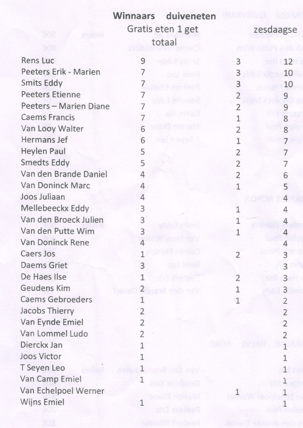 - Kampioen oude duiven Halve Fond: Luc Rens (Oevel)