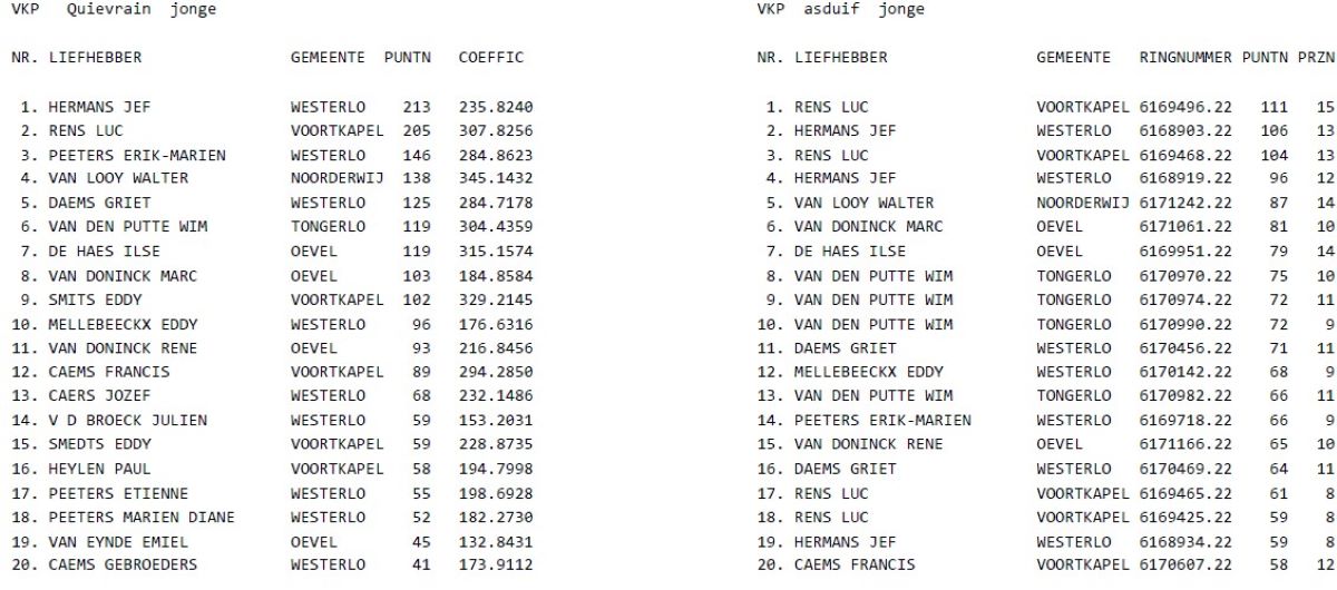 - Kampioen jaarse duiven Halve Fond: Luc Rens (Oevel)