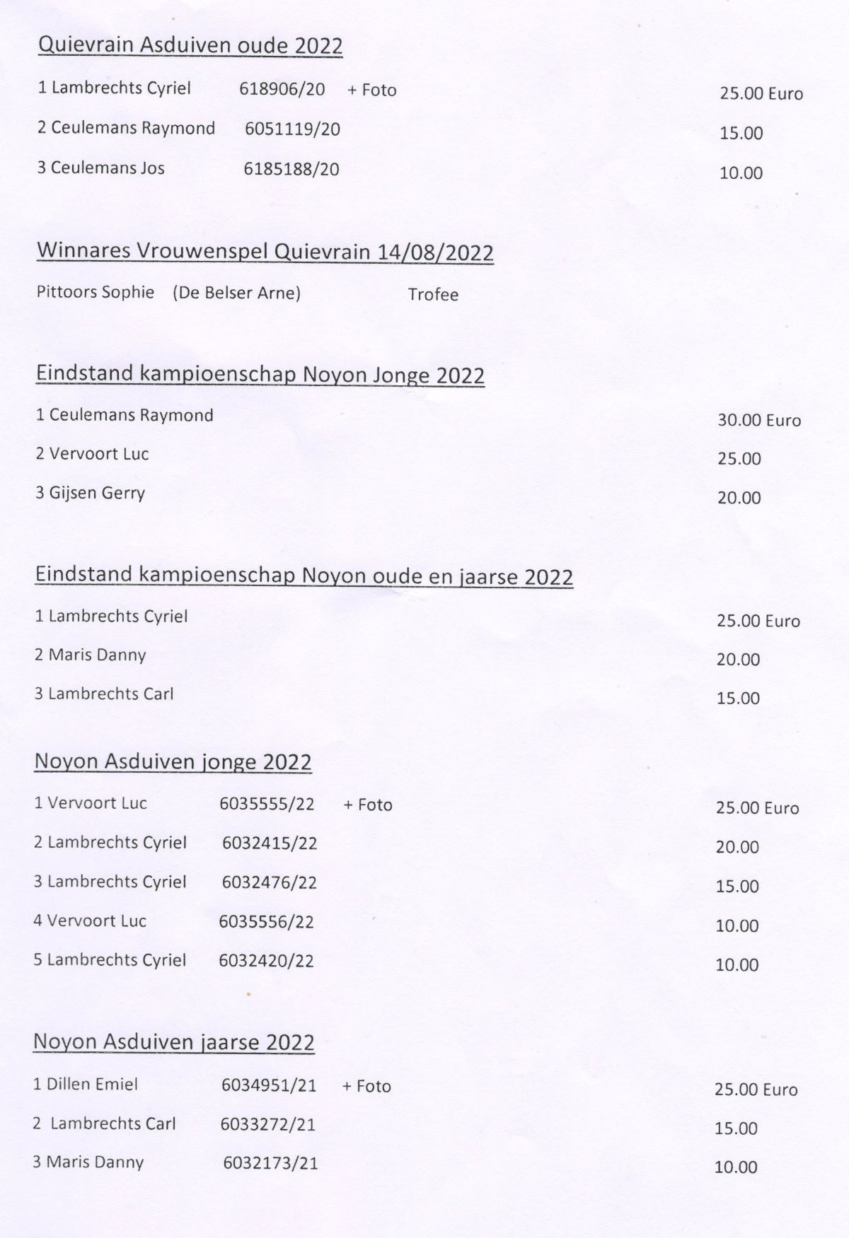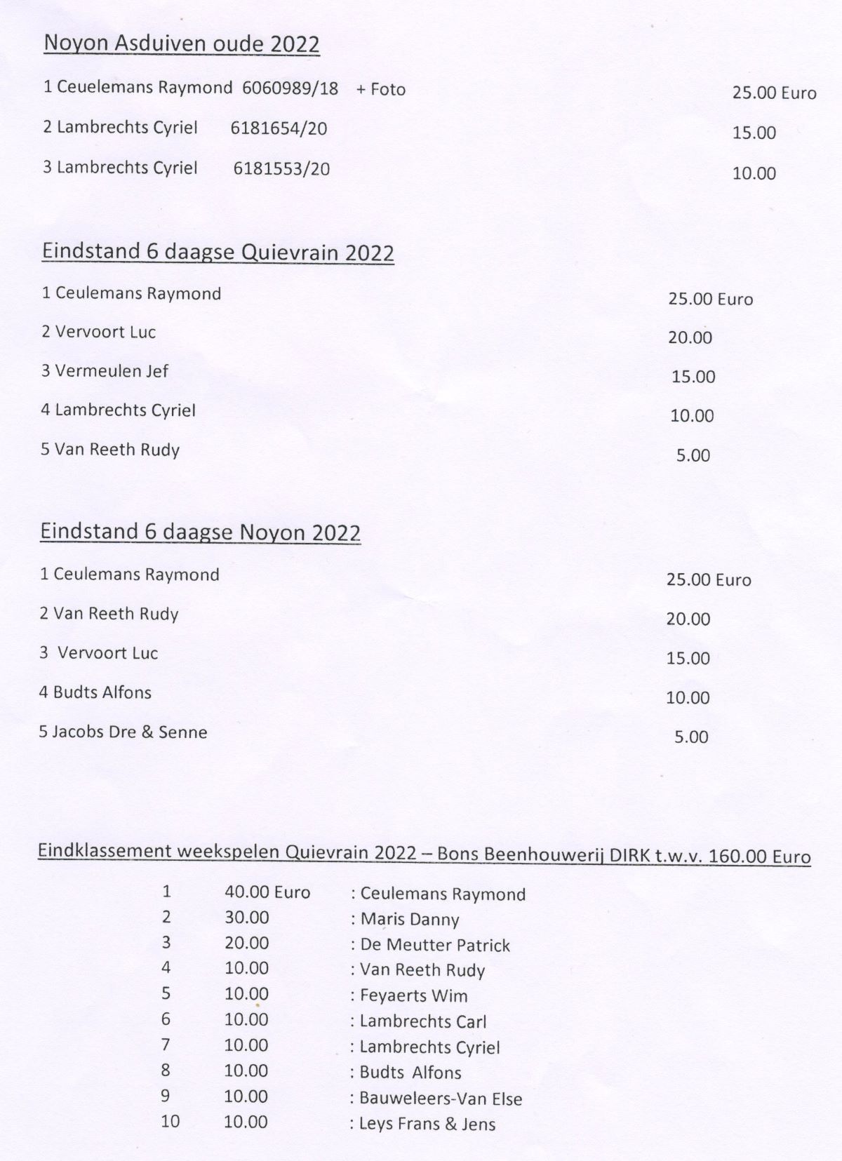 - Kampioen Oude + Jaarse duiven Noyon: Cyriel Lambrechts (Berlaar)