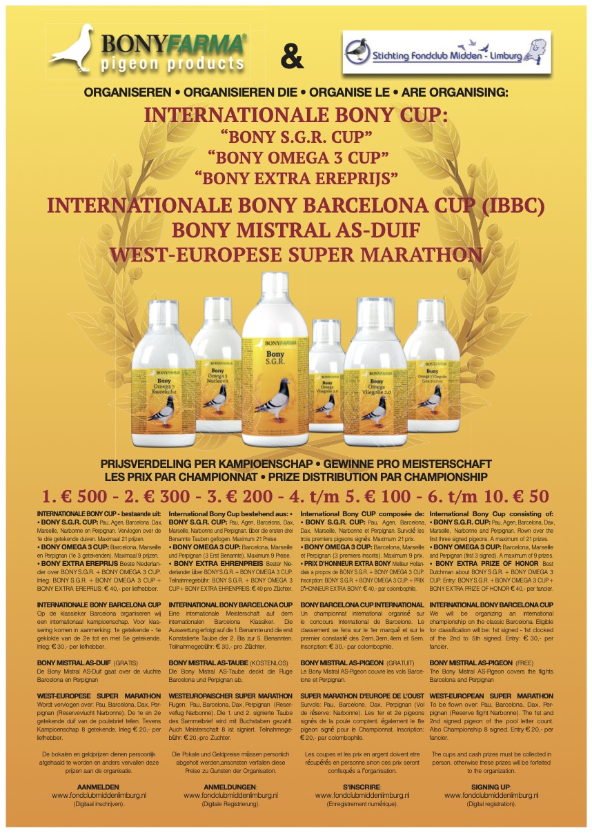Bony Farma Pigeon Products & Stichting Fondclub Midden-Limburg organiseren kampioenschappen.