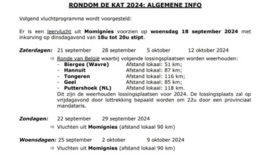 de Kat OPHASSELT Vluchtprogramma najaar woensdag 18 september leervlucht MOMIGNIES - RONDE VAN BELGIE zaterdagen 21-28 sept & 5-12 okt - zondagen 22 & 29 september MOMIGNIES - woensdagen 25 sept, 2 & 9 oktober MOMIGNIES