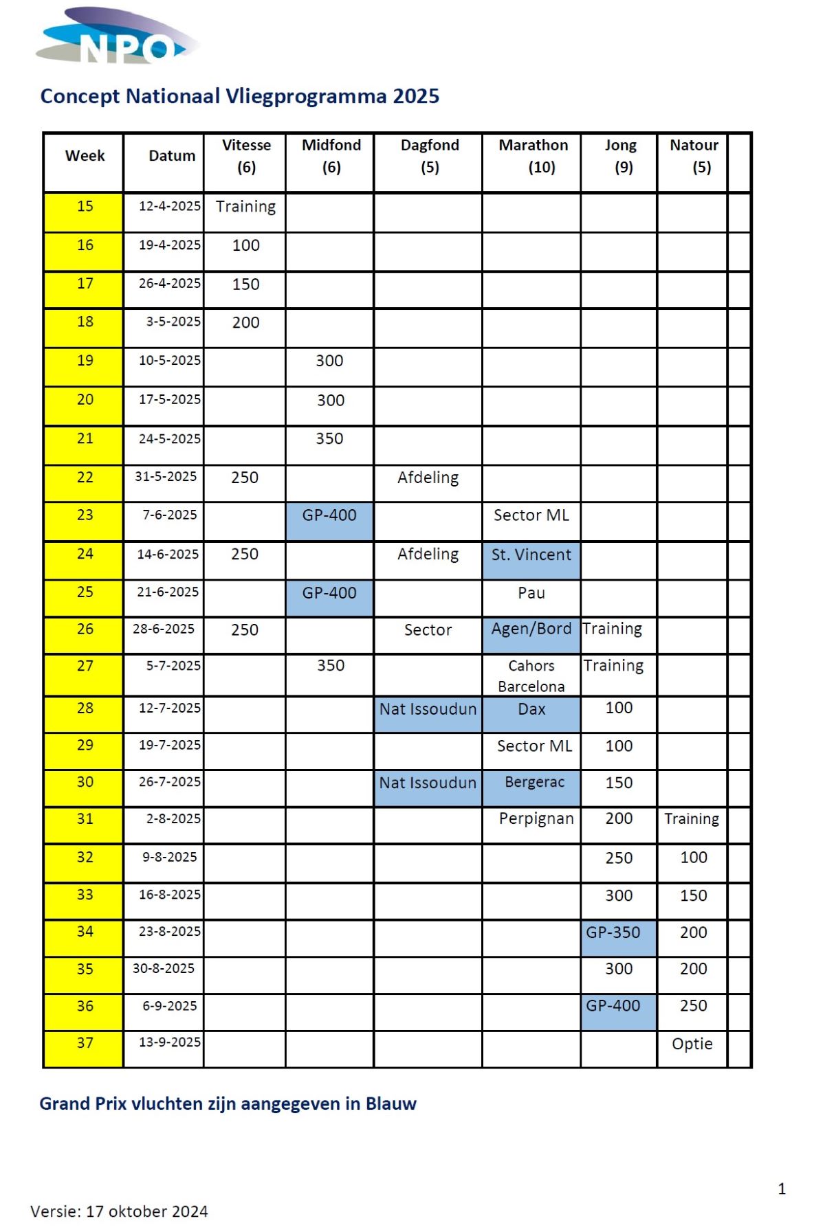 Enkel de vluchten van het Nationaal Vliegprogramma in de categorieën Vitesse, Midfond, Dagfond, Marathon, Jong en Natour tellen voor de Olympiade en WBP competities.