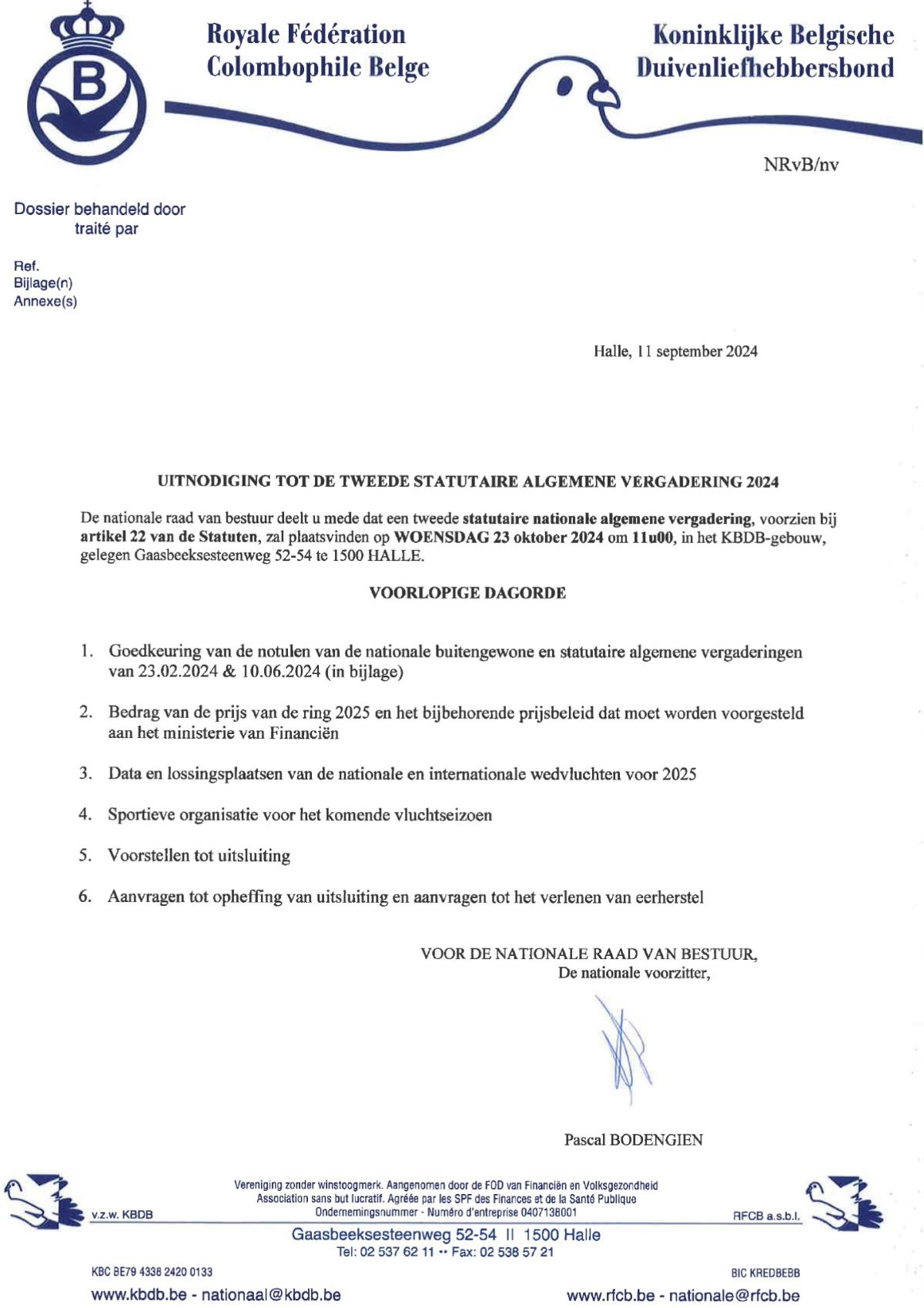 woensdag 23 oktober 2024 om 11u00, in het administratieve KBDB-gebouw, gelegen Gaasbeeksesteenweg 52-54 te 1500 HALLE.