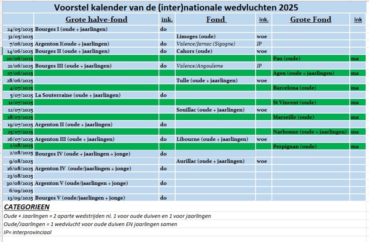 ➔ Deze vluchten kunnen in aanmerking worden genomen voor het nationaal kampioenschap fond (1ste en 2de getekende) en het beste resultaat van deze twee interprovinciale wedvluchten zal meetellen voor het kampioenschap as-duif fond. Zal besproken worden op de NAV van januari/februari 2025