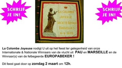 Jaarlijks Feest La Colombe Joyeuyse - Prov., Nationale en Internationale Winnaars PAU - MARSEILLE - EUROPABEKER & ASDUIVEN 2024. Schrijf je vanaf nu in - Zondag 2 maart 2025 12h Feestzaal De Keirk Aalst - info@colombejoyeuse.be