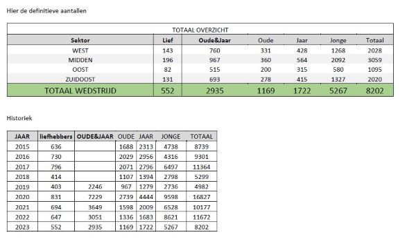 Reeds aangemeld: oude: 412 jaarse: 668 jonge: 2049