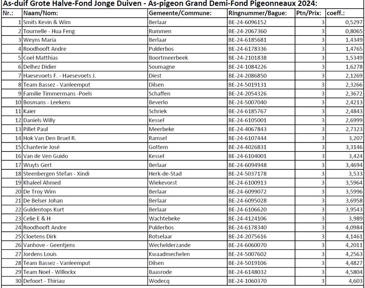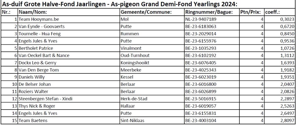 As-duif Grote Halve-Fond Jaarlingen - As-pigeon Grand Demi-Fond Yearlings 2024: