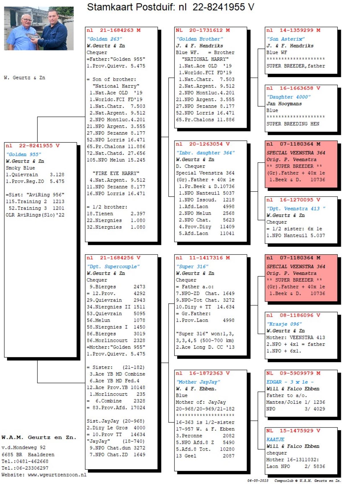 - de moeder is de 'NL21-256', vorig jaar de beste jaarling van het hok met 14 pr. op 15x zetten, gekweekt uit het superkoppel; 'Super 316', o.a. 2. Asd. Dagfond CC & (gr)-vader van o.a. 1.-9.-10. Prov. /NPO en is op zijn beurt wederom een zoon van 'Special Veenstra 364', vader & (gr)-vader van meer dan 40 eerste prijzen, gekoppeld tegen het beste van W. & F. Ebben.