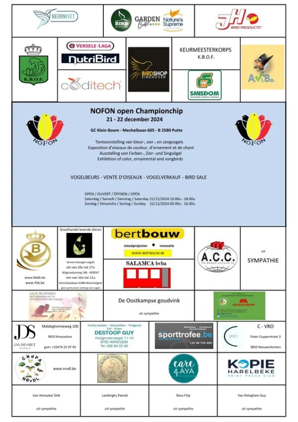 De beurs, de tentoonstelling van de verschillende vogelsoorten en de prijsuitreikingen gaan door in GC Klein Boom, Mechelbaan 605 – 2580 Putte. In de bijlage vinden jullie de affiche met o.a. de openingsuren.