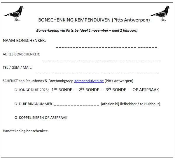 DOE OOK EEN BIJDRAGE (bon/duif/financieel) VOOR PITTS ANTWERPEN (Kempenduiven/Davy Deckers) INFO: davy.deckers@telenet.be - tel 0032 15 22 33 79