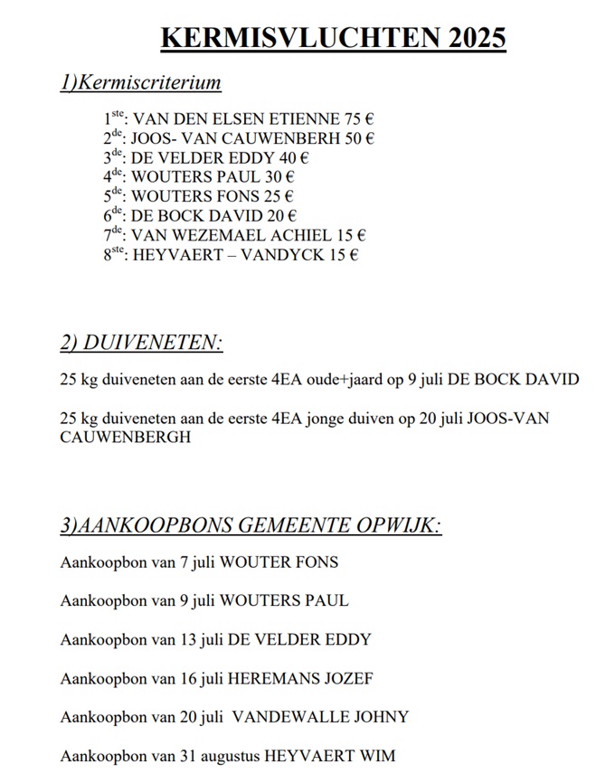 Oude Tortelduif OPWIJK KERMISVLUCHTEN 2025 volledige uitslag