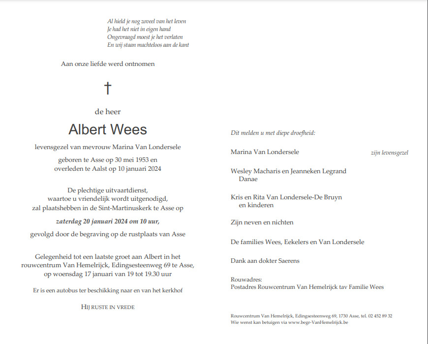 Wij vernemen het droevige nieuws van het overlijden van de heer Albert Wees