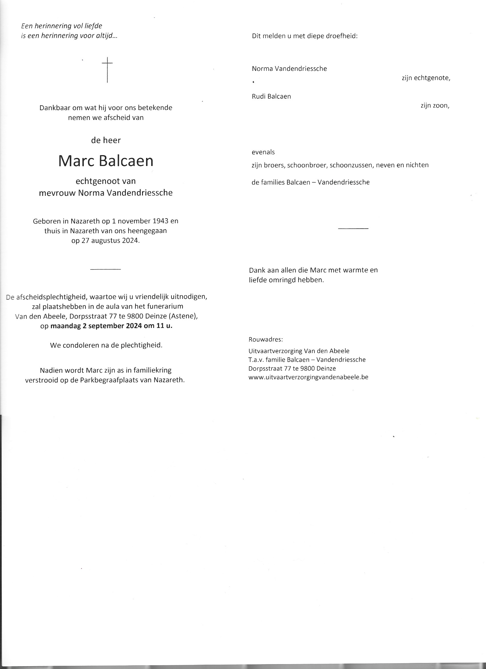 We vernamen het overlijden van Marc Balcaen, vader van Rudi Balcaen.