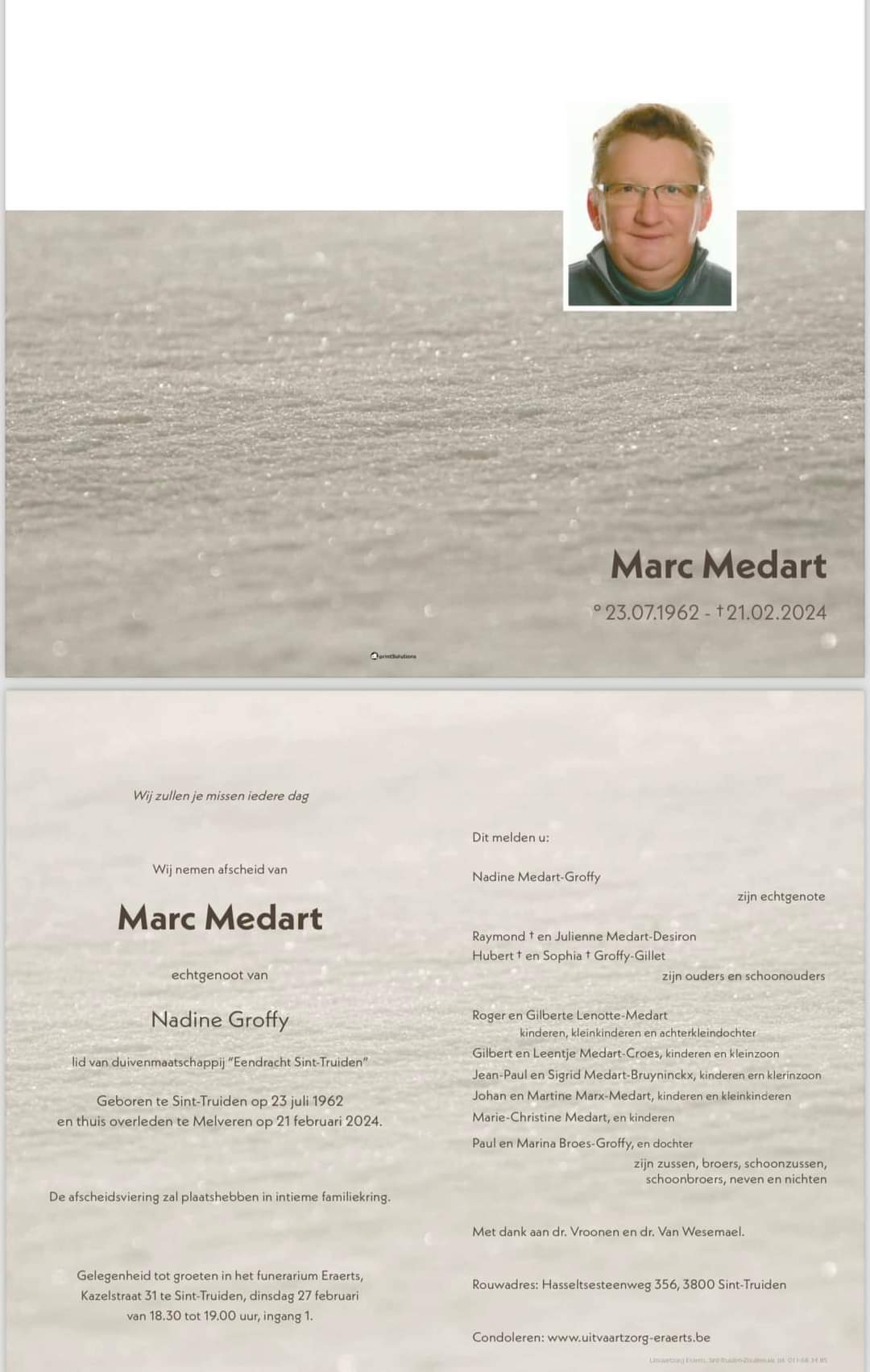 Wij vernamen het plotse overlijden van Marc Medart, lid van duivenmaatschappij "Eendracht Sint-Truiden"