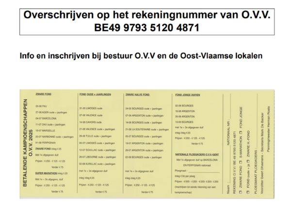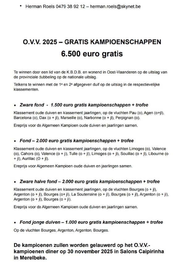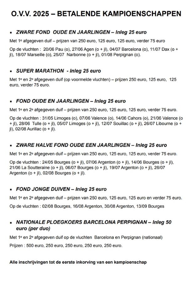 Met genoegen bezorgen wij U een overzicht van de kampioenschappen 2025 die worden ingericht door O.V.V. in bijgaande brochure.