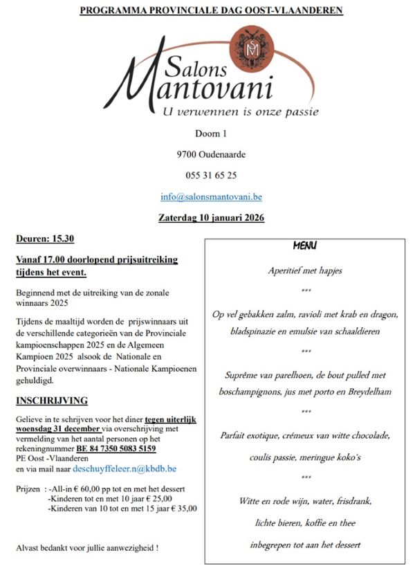Gelieve in te schrijven voor het diner tegen uiterlijk woensdag 31 december via overschrijving met vermelding van het aantal personen op het rekeningnummer BE 84 7350 5083 5159 PE Oost -Vlaanderen en via mail naar deschuyffeleer.n@kbdb.be