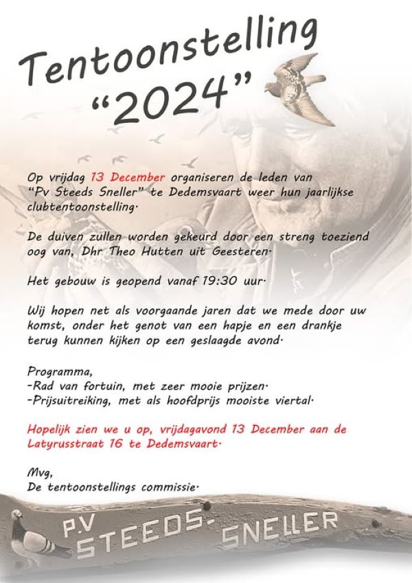 Op vrijdag 13 december organiseren de leden van PV Steeds Sneller te Dedemsvaart Nl weer hun jaarlijkse clubtentoonstelling