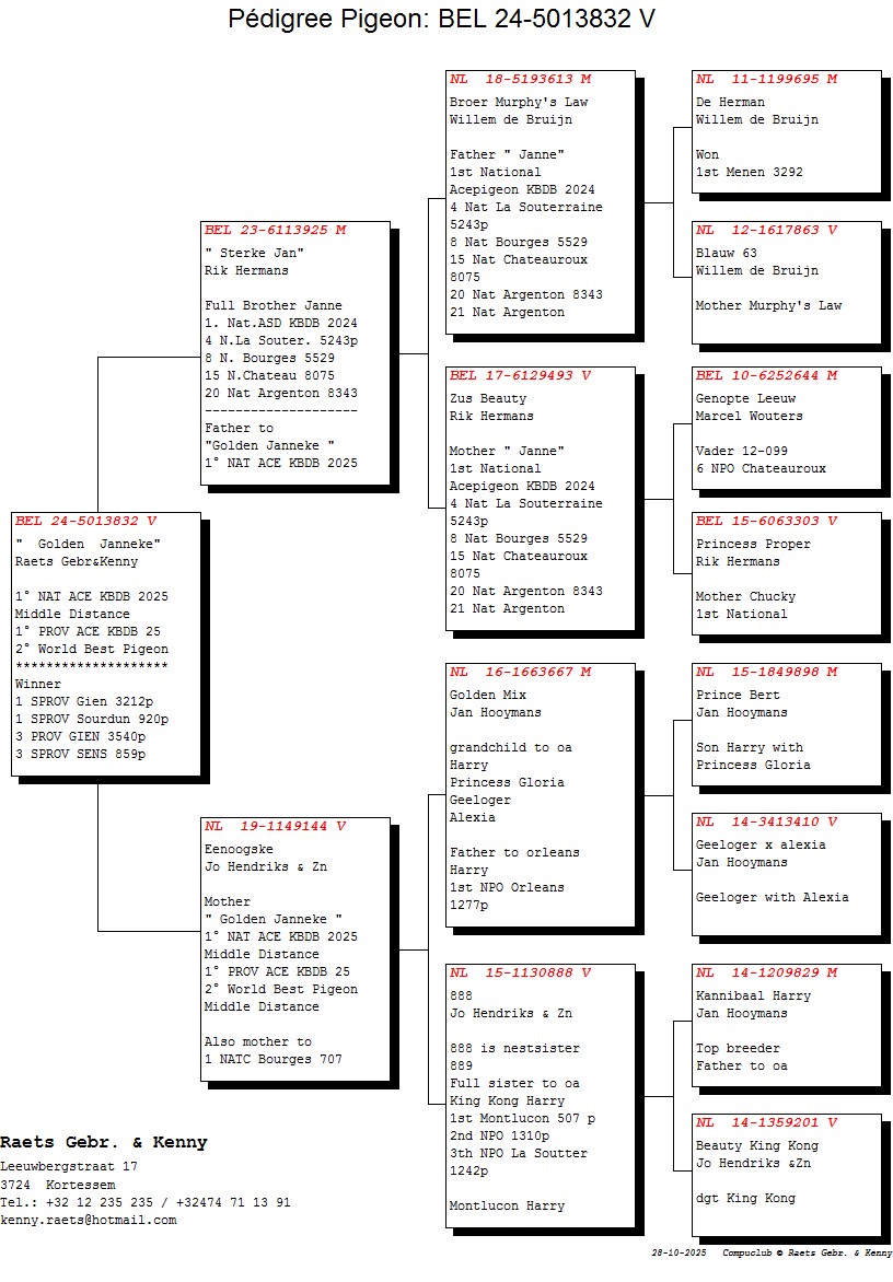 Van 2017 tot 2025 niet minder dan 128 eerste prijzen in het SEMI-Provinciale samenspel Zuid-Oost Limburg, provinciale én nationale asduiven, provinciale en zonale overwinningen en topreferenties bij de vleet, ook op andere hokken... Te mooi voor woorden en te veel om op te noemen! Deze absolute wereldklasse is nu tijdelijk binnen handbereik voor de snelle beslissers!