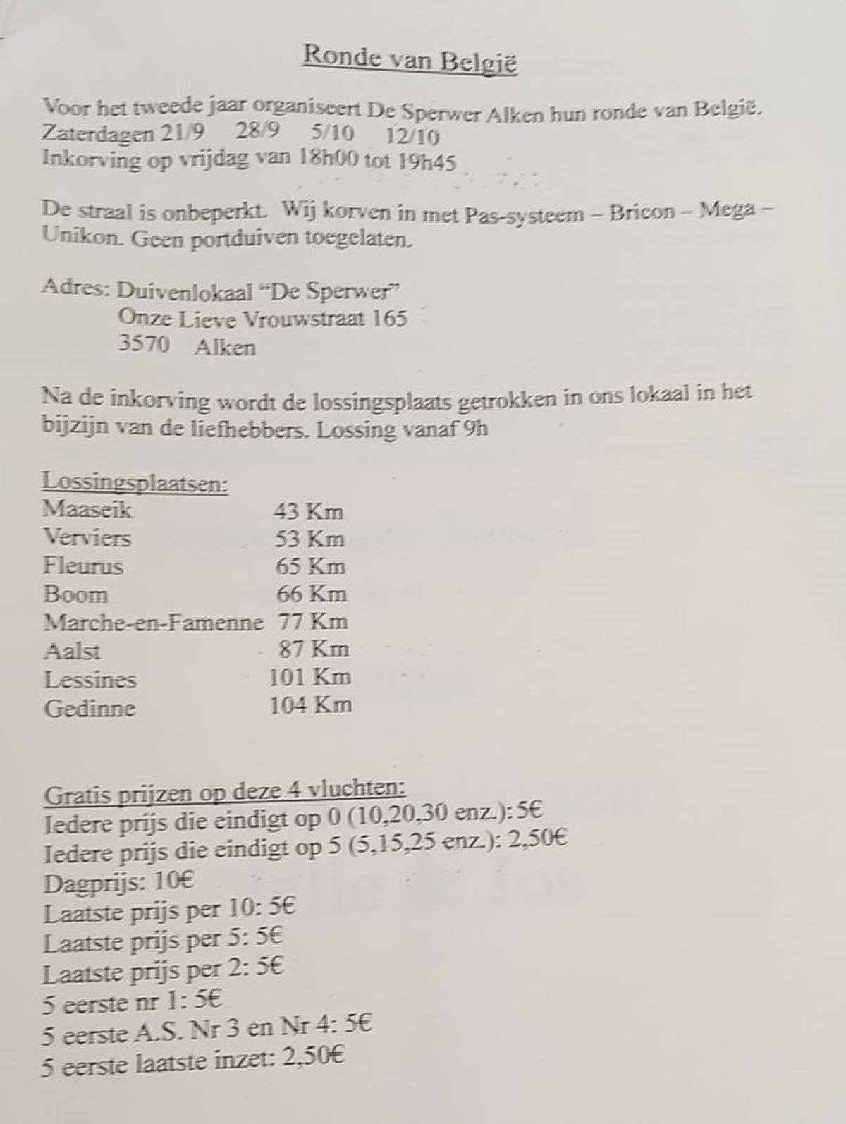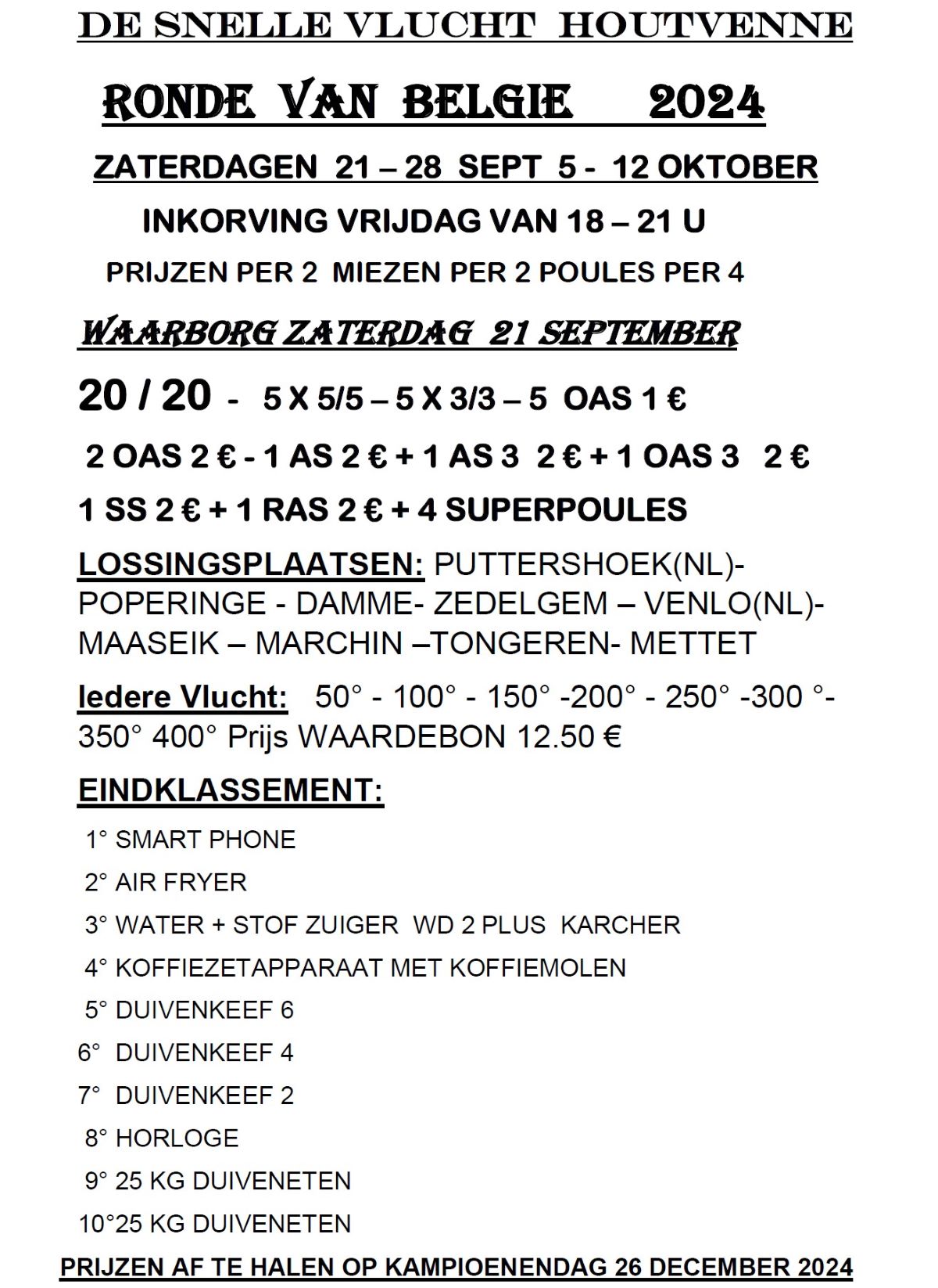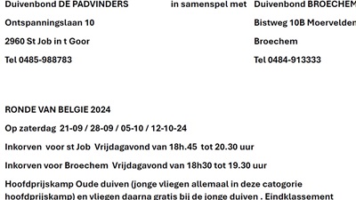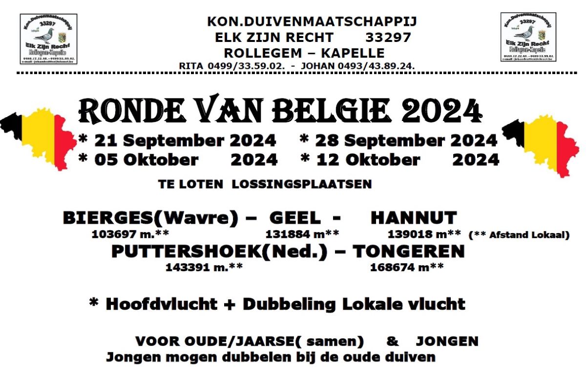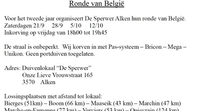 Klik hier voor Snelle Vlucht HOUTVENNE RONDE VAN BELGIE zat 21-28 sept & 5-12 okt