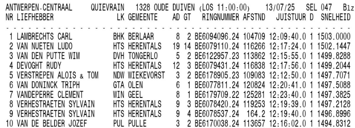 Totaal aantal duiven: 2049 - Laatste update: 31 aug 2025 · 10:01 - Winner: Iwens Jan & Tom