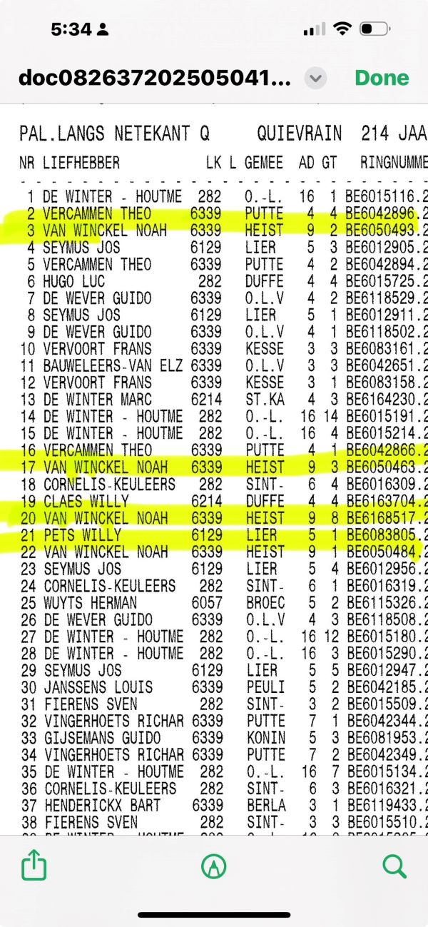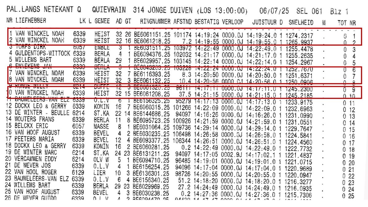 FB Van Winckel Family Loft 5 mei Nest sister Golden Leo 494 (winner of 1st price against 4000 pigeons and 2nd Ace) getting her 2nd 3rd [🥉] price of the season. She is a Van den Bulck (via Geert Krauss) and related to King Arthur and Blizzard King Kittel. [👍🏼] 3 first assigned pigeons all per /10 price.