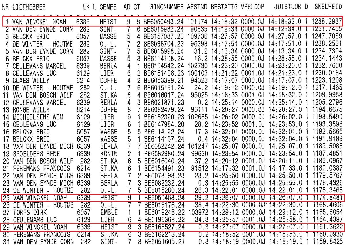- Fam. Van Winckel: 3de kampioen jonge, 1ste asduif jonge