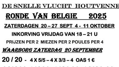 DE SNELLE VLUCHT HOUTVENNE RONDE VAN BELGIE 2025 ZATERDAGEN 20 – 27 SEPT 4 - 11 OKTOBER INKORVING VRIJDAG VAN 18 – 21 U