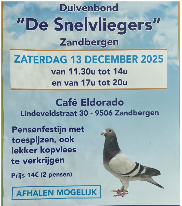 PENSENFESTIJN 2025 - 13 DECEMBER 2025 hierbij nu reeds info voor ons jaarlijks pensenfestijn op zaterdag 13 december 2025 in ons lokaal EL DORADO - ZANDBERGEN