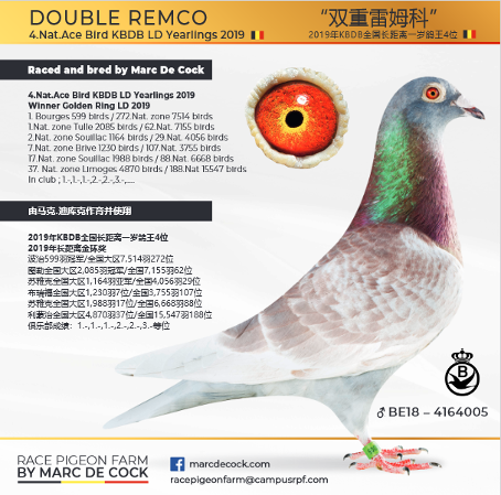 "Double Remco", door mij gekweekt en gespeeld , behaalde titel van 4e nationale asduif op de fond in 2019