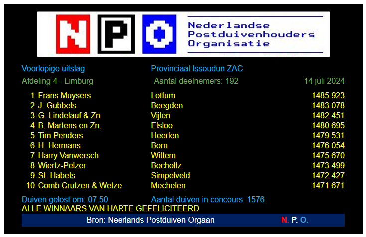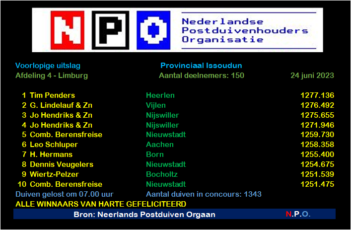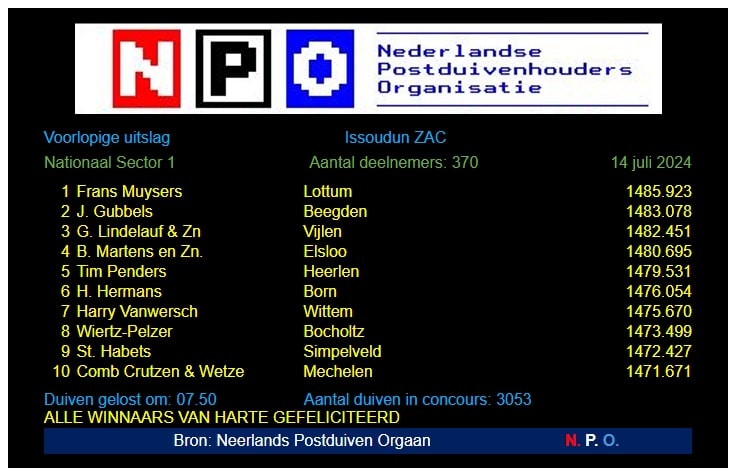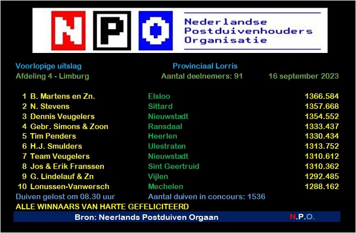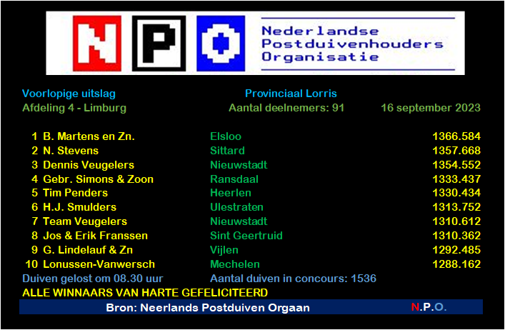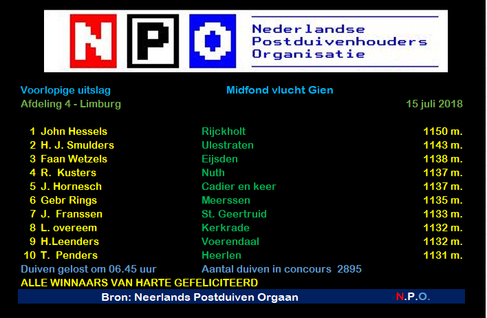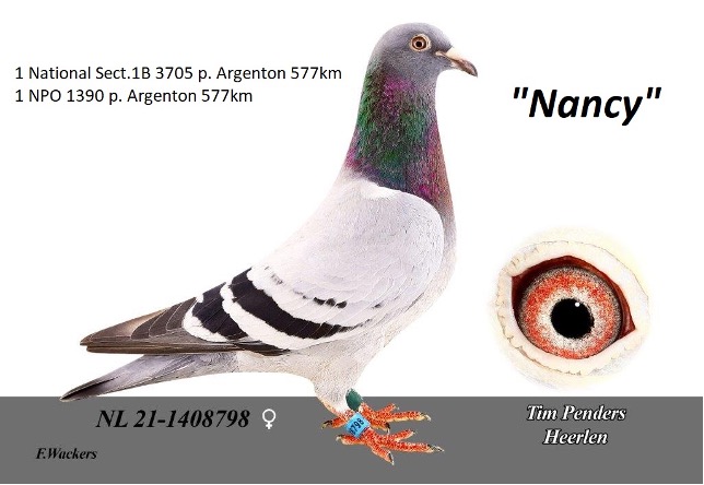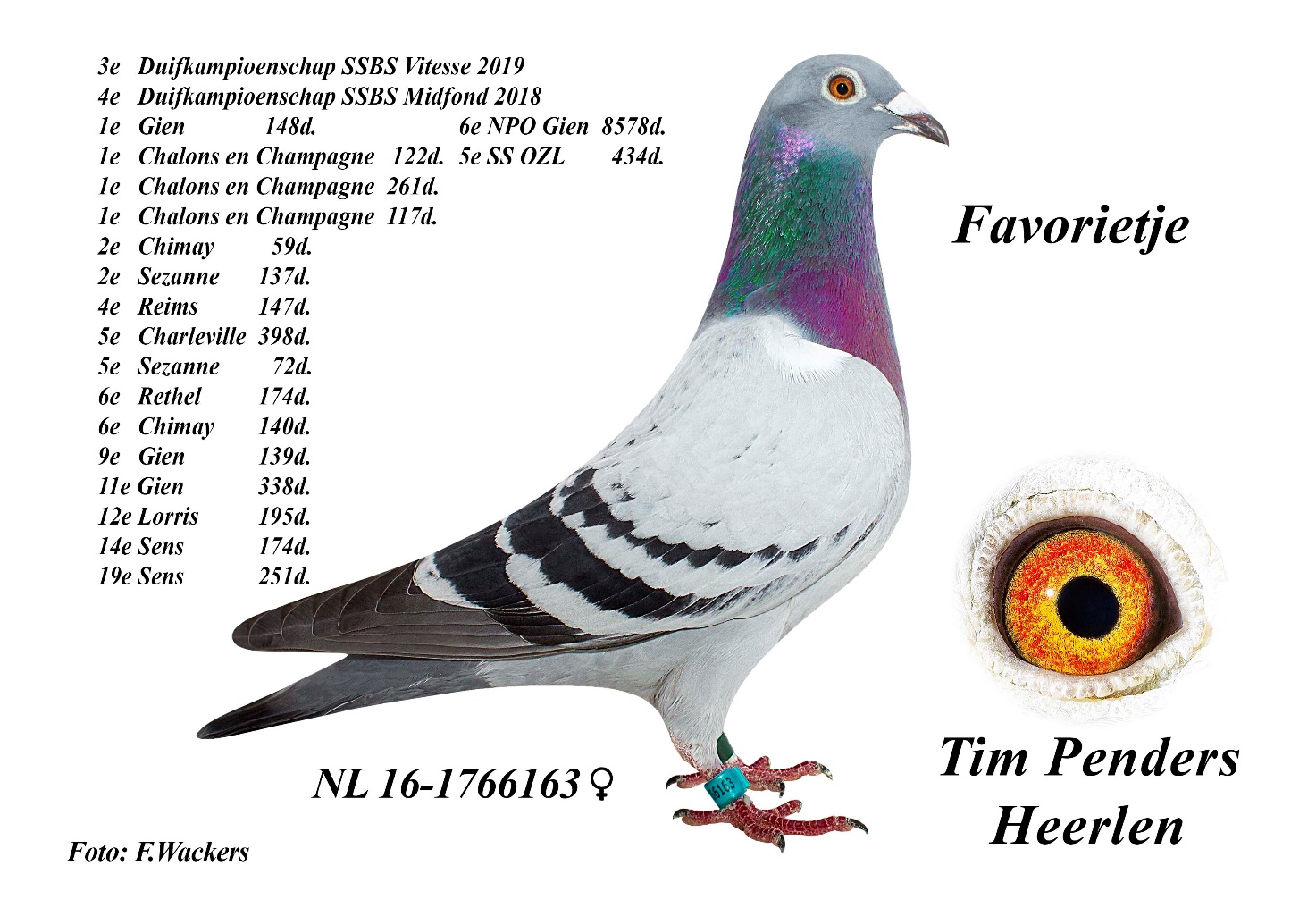 - “Favorietje” (stamduivin Tim) (3e asduif Midfond, 4 x 1e prijs en 6e NPO Gien 8578 duiven). Lijnen Jo en Florian Hendriks en het soort van Jan Ouwekerk.