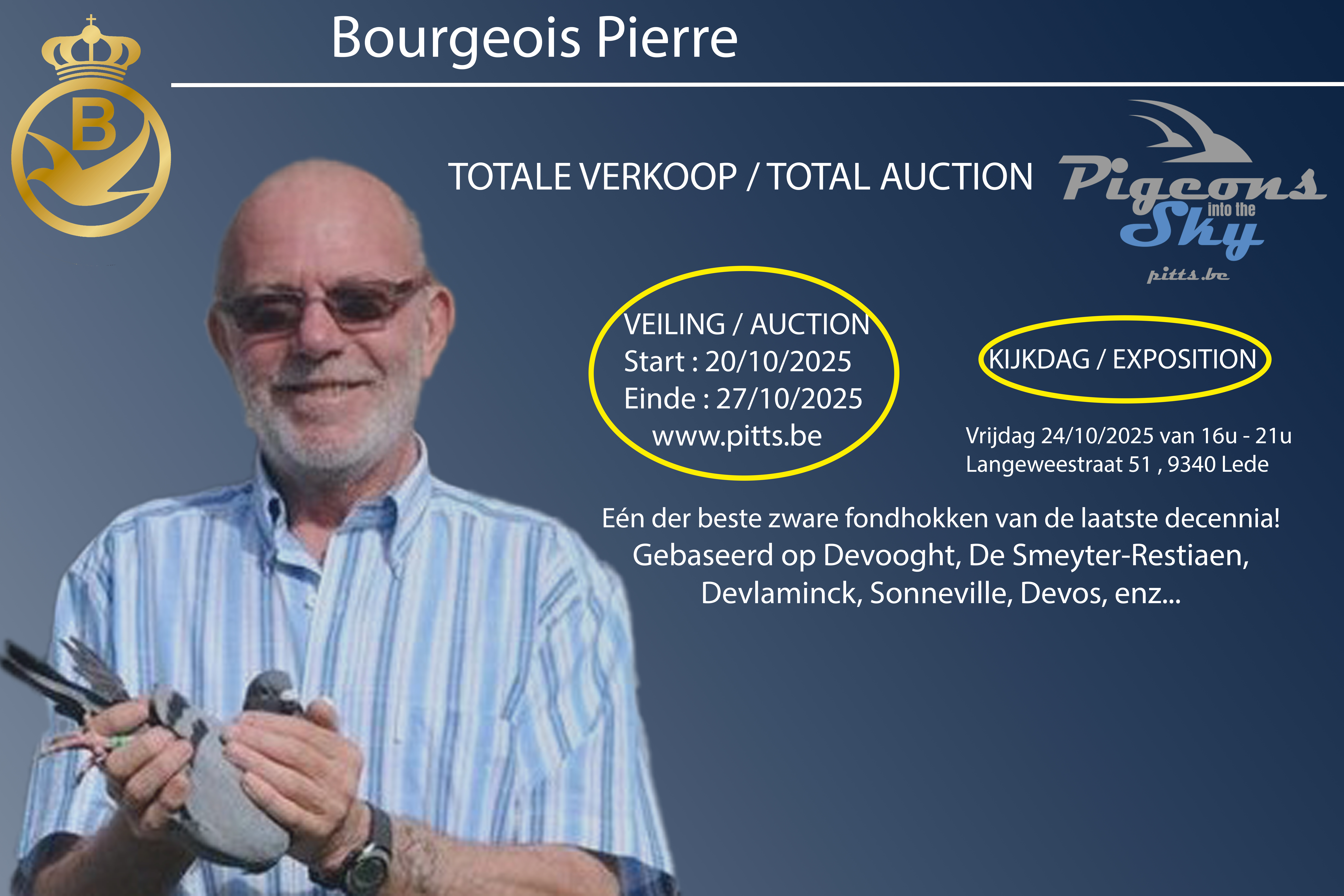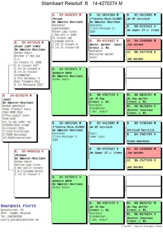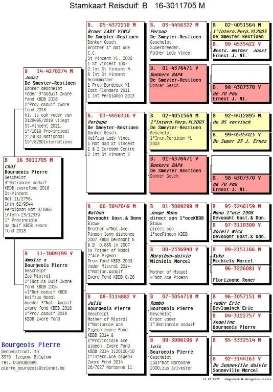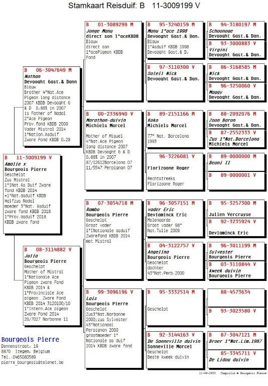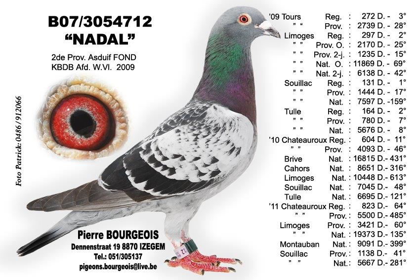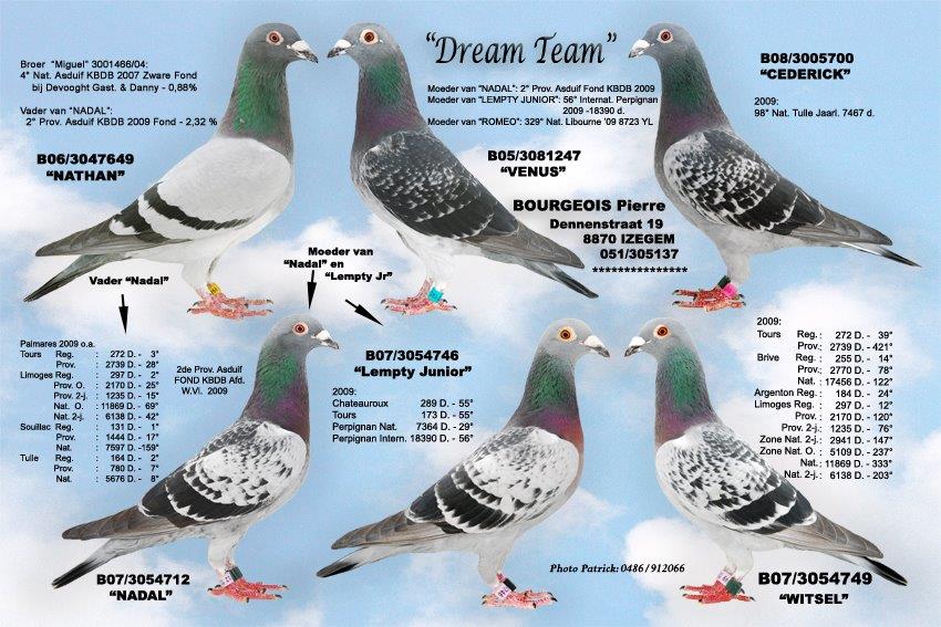 De basis van het hok Bourgeois gaat terug op de oude stam van niemand minder dan Devooght Gaston & Danny, meer bepaald de lijn van absolute topper “Manu” ( 1e Asduif Fond). Zo verhuisde oa. de broer van “Miguel” (4e Asduif zware Fond KBDB 2007) de 649/06 “Nathan”, vader van 3054712/07 “Nadal” (1e Asduif Pipa-ranking over 3 jaar Fond 2009, 2010, 2011 en 2e Provinciale Asduif Fond 2009 gevlogen bij Pierre Bourgeois himself). Duidelijk één van de steunpilaren van het hok Bourgeois. Zijn halfbroer “Lemty Junior” is tevens stamvader en overgrootvader van ‘495/19’: 2e Nationaal St-Vincent 2021 en 26e Nationaal Perpignan 2022. Deze formidabele topper miste geen enkele keer vanaf Bourges tot en met Perpignan in 2022. Hij is een halfbroer van de 3e Nationale Asduif Zware Fond 2018 “Choi”, gekweekt met het ras van De Smeyter-Restiaen waar Pierre een inteelt kleinzoon verkreeg van “De Joost”: 1e Internationaal Perpignan. Daarnaast zien we ook duiven van Marcel Sonneville (Deseyn-Vandemeulebroecke en Lidou), Erik Devlaminck, Etienne Devos. Uit deze rassen kweekte Pierre zijn beste duif ooit: 3120100/10 “Mistral” 1e internationale Asduif Zware fond 2014 met 0,26 % en 1e Nationale Asduif Zware Fond 2014 met 0,28 %! Zijn zus “Amalie” is tevens moeder van “Choi”: 3e Nationale Asduif zware fond kbdb 2018.