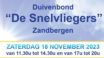 Het bestuur van duivenmaatschappij 'DE SNELVLIEGERS' heeft het genoegen je uit te nodigen op zijn jaarlijks eetfestijn die doorgaat op zaterdag 18 november 2023 in zaal 'Eldorado', Lindeveldstraat 30 te 9506 Zandbergen.