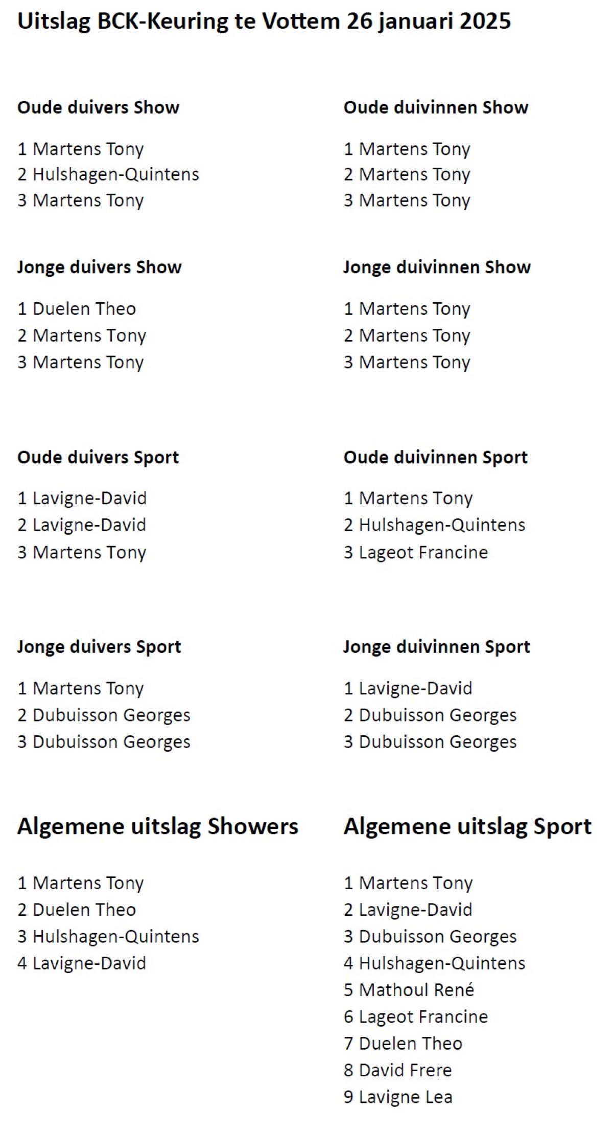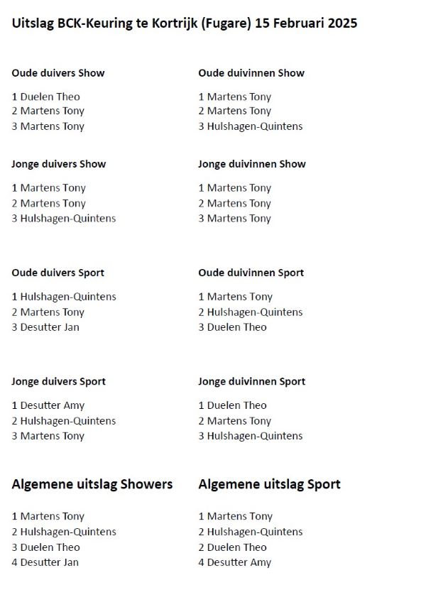 Uitslag BCK-Keuring te Kortrijk (Fugare) 15 Februari 25