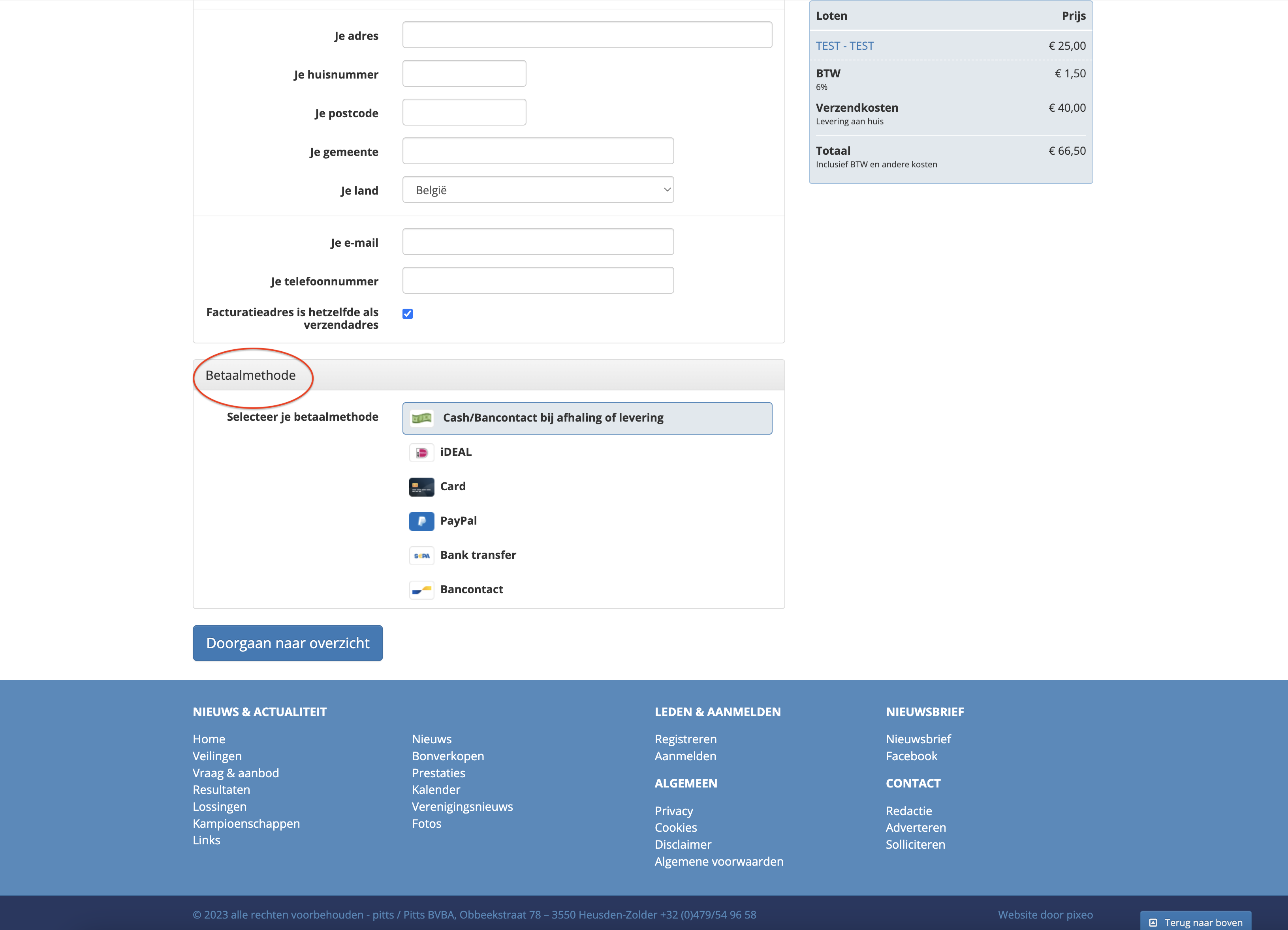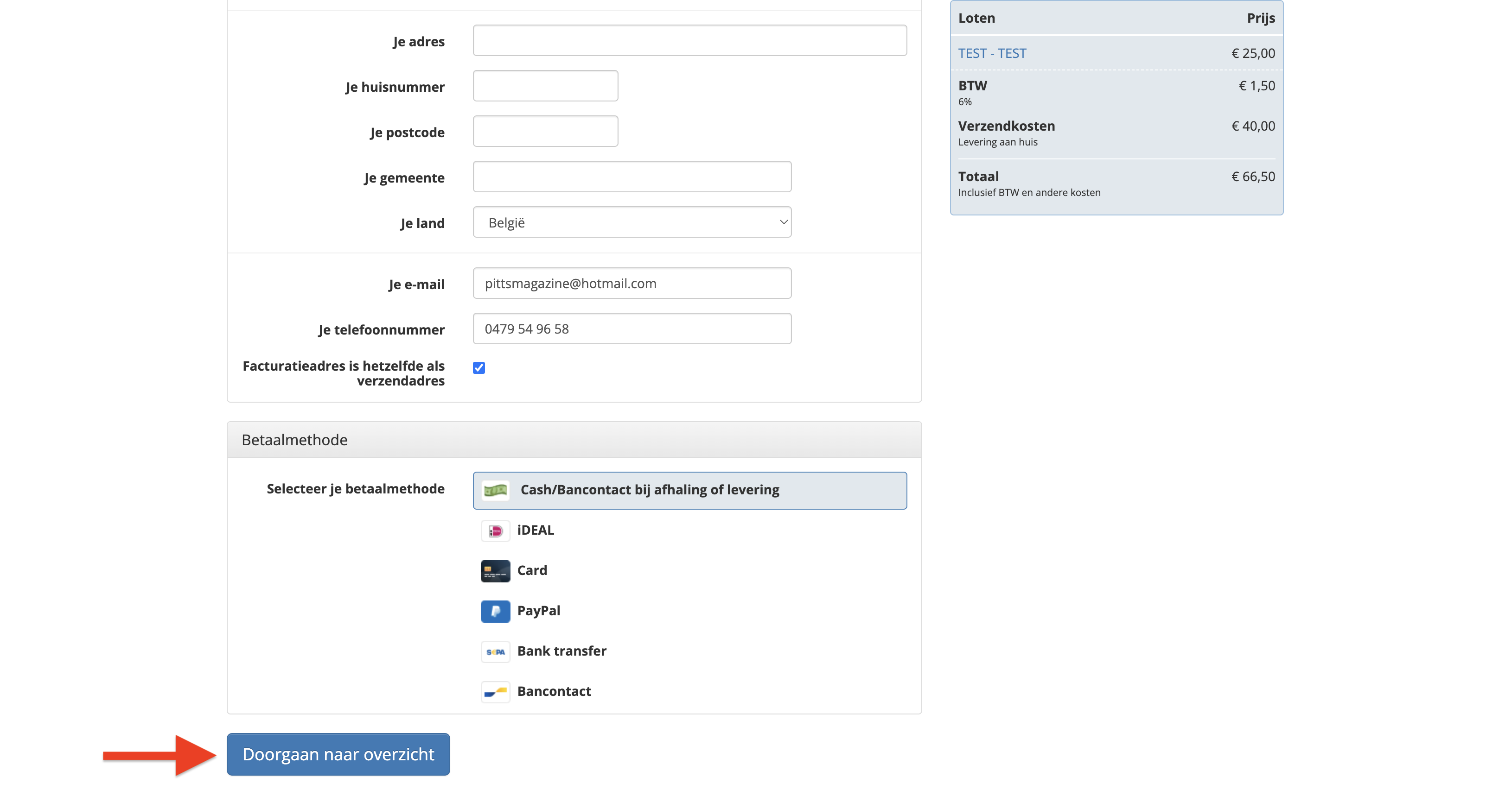 Wanneer u alle gegevens heeft ingevuld gaat u via de knop "Doorgaan naar overzicht" verder naar de overzichtspagina waar u controleert of alle gegevens juist zijn. Hierna zal u via "Doorgaan naar betalen" doorgestuurd worden naar onze betaalpartner of indien u de keuze "Cash/bancontact bij afhaling of levering" heeft gemaakt een bevestiging krijgen.