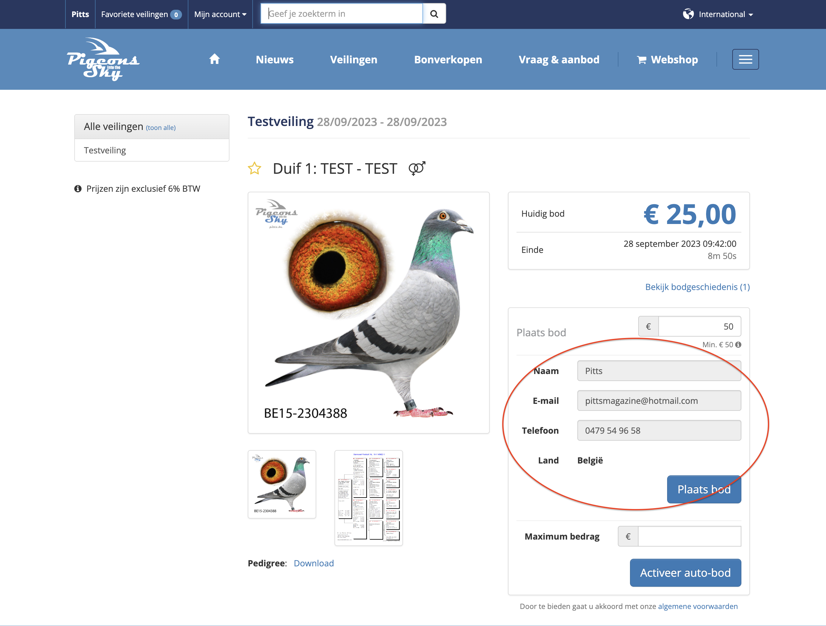 - Wanneer u ingelogd bent staan uw gegevens automatisch ingevuld als u een bod wilt uitbrengen --> u moet dit dus niet meer telkens zelf invullen
