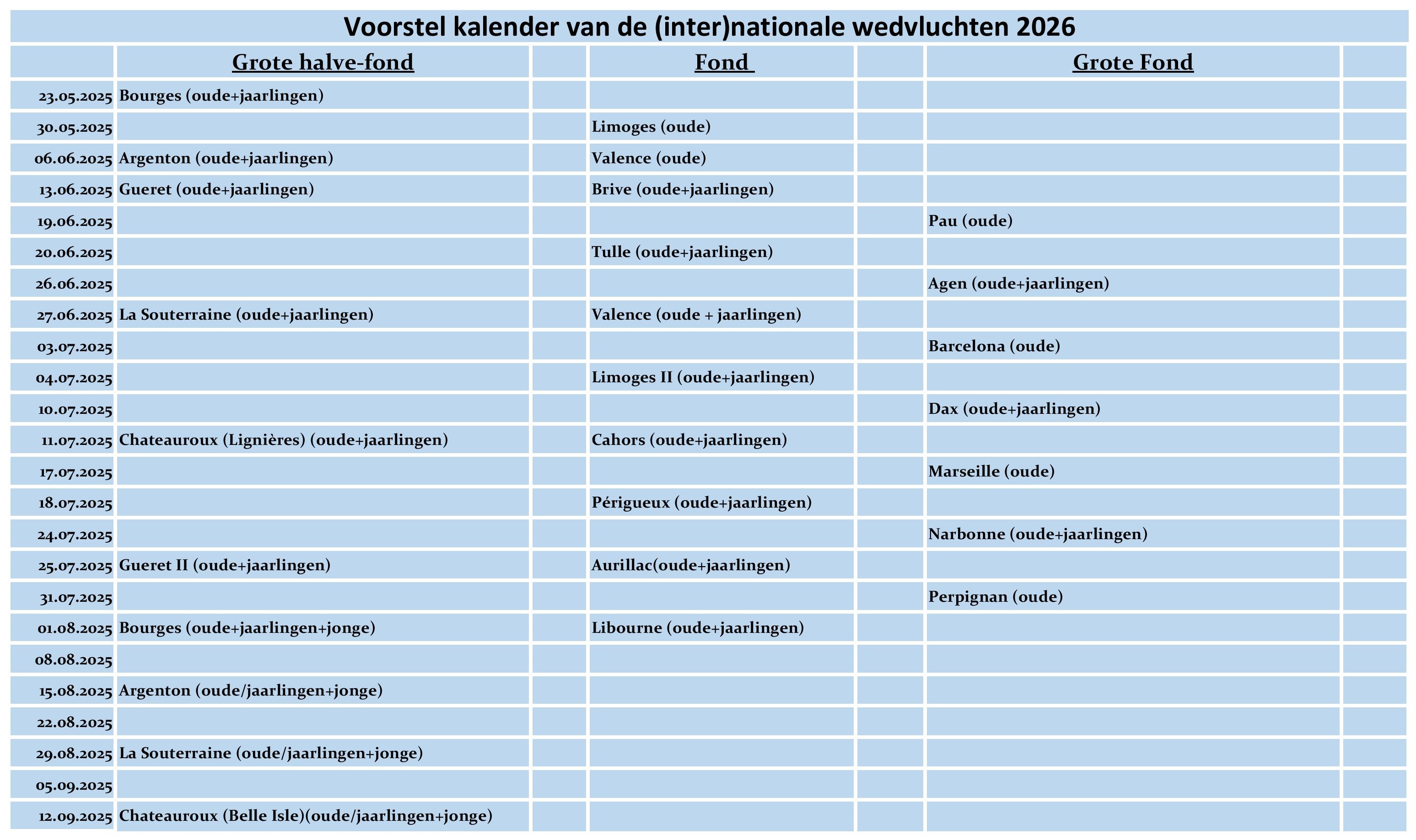 Logische opbouw voor jaarse duiven op de fond: De volgorde en zwaarte van de vluchten zijn zodanig opgebouwd dat de natuurlijke ontwikkeling van de jaarse duiven wordt gevolgd.
