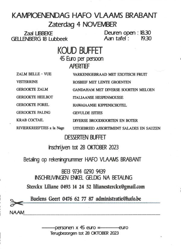 De inschrijvingen voor het buffet zijn nu geopend. U kunt zich inschrijven via Geert Buelens en Liliane Sterckx of via onze website (vanaf woensdagavond). Let op, uw inschrijving is pas geldig na betaling. De deelname aan het buffet bedraagt 45€ per persoon.